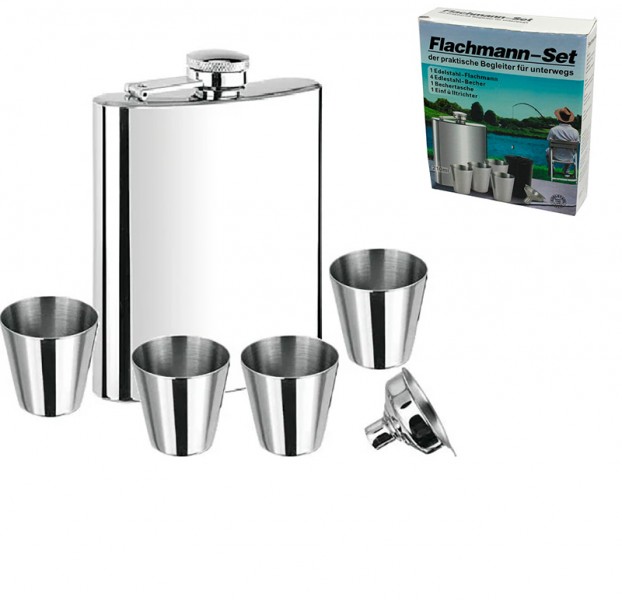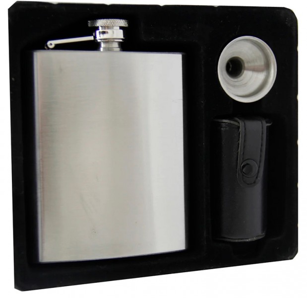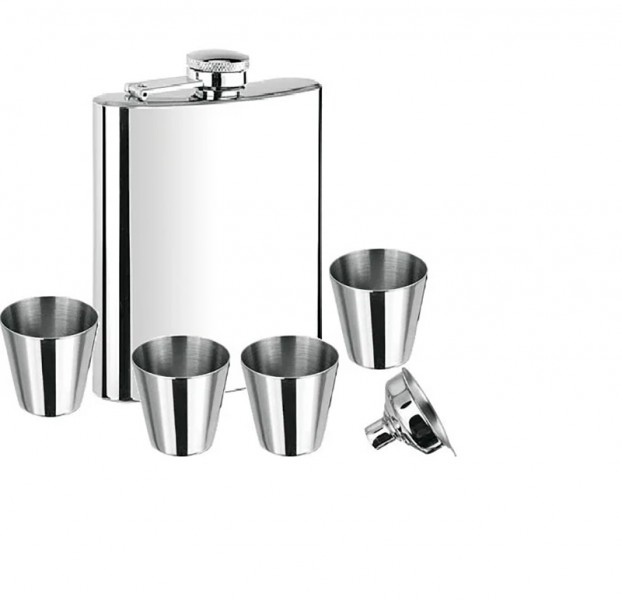 В набор входит: Фляга из нержавеющий стали, объемом 7 oz, 4 стаканчика и лейка.