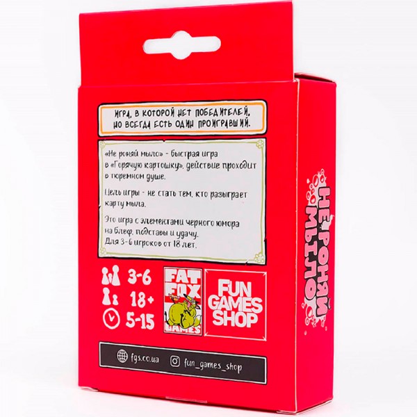 Коротко о правилах: Кто-то из игроков берёт на себя роль дилера. Он находит одну карту мыла в колоде и выдаёт её игроку с самой крутой задницей. После этого дилер перемешивает колоду и выдаёт по 5 случайных карт каждому игроку (или по 4, если вы играете вшестером). Оставшиеся карты нужно положить стопкой в центре стола рубашкой вверх - это колода. Игра начинается - игрок, которому было выдано отдельное мыло, ходит первым. Игроки ходят по очереди по часовой стрелке и в свой ход разыгрывают одну карту с руки (только одну). Эта карта отправляется в сброс (отдельная стопка карт, лежащих в открытую рядом с колодой), и после этого разыгрывается её эффект. Не нужно добирать в руку карты из колоды, если этого не сказано в разыгранной карте. Карты мыла разыгрываются, только если у вас больше нет никаких вариантов - вы роняете мыло, упс!