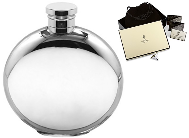 Фляга для алкогольных напитков под гравировку от компании English Pewter. Сделано из пищевого олова в Великобритании. Ручная работа. Высота изделия 11 см, ширина 6 см. Поставляется в фирменной подарочной коробке.