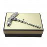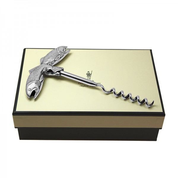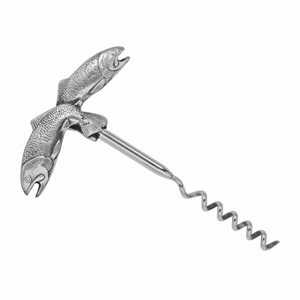 Ручка этого оригинального штопора изготовлена из пьютера (сплава пищевого олова) в форме двух рыб, соединенных хвостами; материал рабочей части – нержавеющая сталь. Страна-производитель – Великобритания. Поставляется в фирменной подарочной упаковке размером 5,4 х 17,0 х 11,8 см.