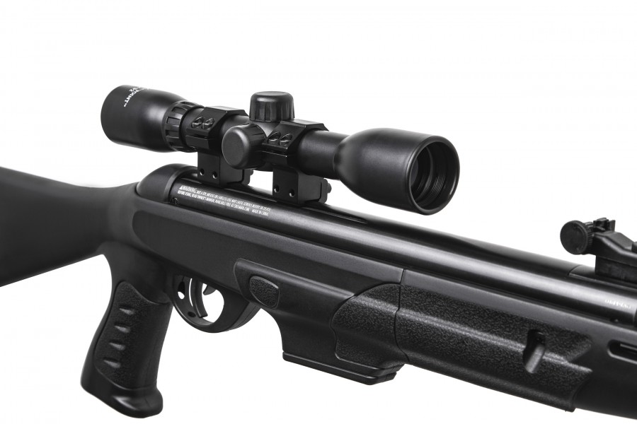 Если говорить о точности стрельбы, то немаловажным является наличие качественно выполненных открытых прицельных приспособлений (целик и мушка), а также в комплекте идёт прицел от известного производителя оптики для пневматических винтовок, CenterPoint с кратностью 4х и линзой 32 мм. Прицельная марка выполнена в виде привычного и удобного перекрестья.