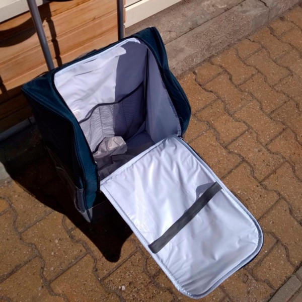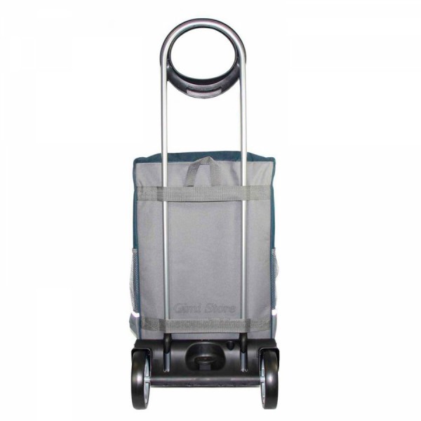 - Дополнительные характеристики: Прочная сумка-тележка имеет U-образный доступ, изотермическая, 2 колеса, подножка, 2 боковых кармана, держатель для зонта, крючки для ящиков.