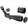 Фокусировка решена в виде маховичка небольшого диаметра, расположенного в центральном положении, что удобно для использования, независимо от того какой рукой проводить фокусировку. Для большего комфорта наблюдений применен поворотно-выдвижной наглазник. Выдвижная бленда обеспечивает надежную защиту и от солнечных бликов и от осадков. Крышки объектива и окуляра надежно фиксируются на своих местах и точно не потеряются во время движения.