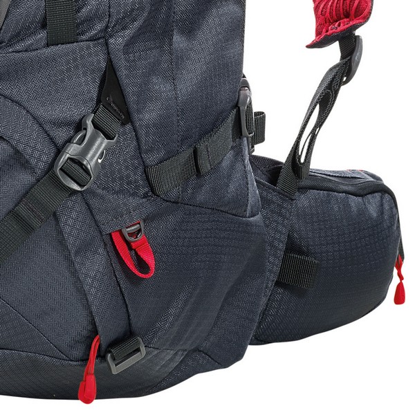 Отдавая дань сегодняшнему тренду легкоходного туризма, компания Ferrino ставит целю не максимальное снижения веса, а достижение минимального веса, при сохранении надежности и функционала снаряжения. Обновленные рюкзаки Ferrino Overland стали заметно легче, копактней, сохранив прежний полезный объем и универсальность. Они по-прежнему являются самыми технологичными и многофункциональными в линейке треккинговых рюкзаков производителя. Рюкзак оборудован под гидросистему и оснащен съемным чехлом от дождя. Наибольшего внимания заслуживает съемный клапан, который можно использовать автономно в виде малого рюкзака или поясной сумки для радиальных выходов. Кроме основного входа, рюкзак имеет еще и два больших фронтальных, служащих для удобства загрузки и извлечения необходимых вещей. Пространство рюкзака разделено перегородкой на верхнее и нижнее. В нижнюю часть рюкзака удобно паковать обувь, спальный мешок и др. Достаточное количество карманов (большой фасадный, два боковых, поясной, двойной наружный на клапане и один внутренний) позволяют организовать упаковку всех мелких вещей максимально удобно. Интересен рюкзак и тем, что на него можно навесить большое количество снаряжения снаружи. На фасаде имеется два крепления для палок или ледорубов. Боковые и нижние стяжки фиксируют достаточно объемные вещи, так как имеют значительный запас по длине. При необходимости можно использовать и 2 дополнительных стропы, которыми укомплектован рюкзак. Для каждой такой стропы имеется пара лямок на рюкзаке. С их помощью могут быть зафиксированы даже лыжи или сноуборд. В отличие от более вместительной модели, данный рюкзак оснащен подвесной системой с фиксированной универсальной высотой, что дало возможность значительно уменьшить вес.