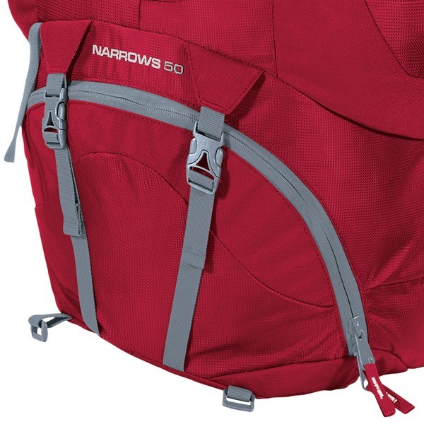 Серия треккинговых рюкзаков Ferrino Narrows является дальнейшим усовершенствованием популярной и недорогой серии Esterel и нацелена на предоставление наибольшего объема всех отделений, благодаря чему в данный рюкзак удобно упаковывать действительно объемные вещи. Необычная компоновка прослеживается в разделении основного отделения на два практически равных отсека. Верхний отсек варьируется вытяжным клапаном и не имеет различного рода карманов, крадущих пространство основного объема. Фронтальный вход ведет в нижний большой отсек рюкзака. Тут без проблем вмещается достаточно большой трехсезонный спальник или пара зимних треккинговых ботинок. Боковые карманы также просторны и свободно вмещают флягу объемом полтора литра. Пара карманов в клапане на молнии с карабином для ключей так же очень вместительные. А на фронтальной панели размещается эластичная стяжка для крепления таких объемных вещей, как куртка или кофта. При необходимости пристегнуть дополнительное снаряжение, можно использовать пару нижних компрессионных стяжек, либо дополнительные стропы, которыми укомплектован рюкзак. Подвесная система достаточно уникальна, проста, но эффективно справляется со своим назначением, разгружая позвоночник, обеспечивая доступ воздуха к спине и надежно фиксируя рюкзак во время ходьбы. На фасаде рюкзака имеются крепления для треккинговых палок или ледоруба.