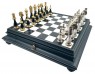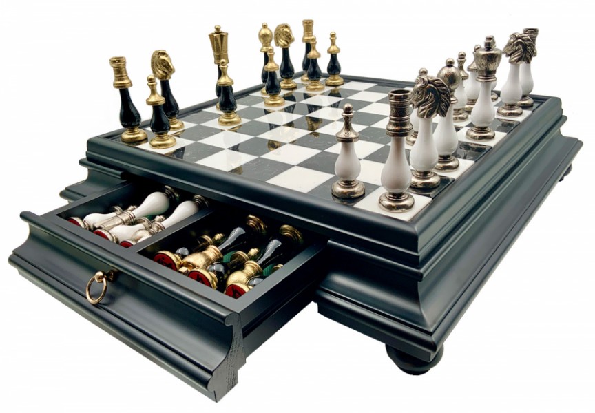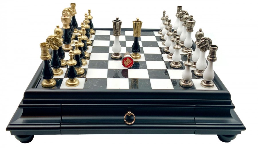 Шахматы всемирно известного итальянского бренда Italfama. Доска изготовлена из дерева и мрамора с выдвижной шухлядкой для хранения фигурок. Размеры доски: 47 x 47 x 12 cm, размер квадрата: 4,5 cm. Фигурки коллекции "Arabescato" изготовлены из цинка, латуни, никеля.