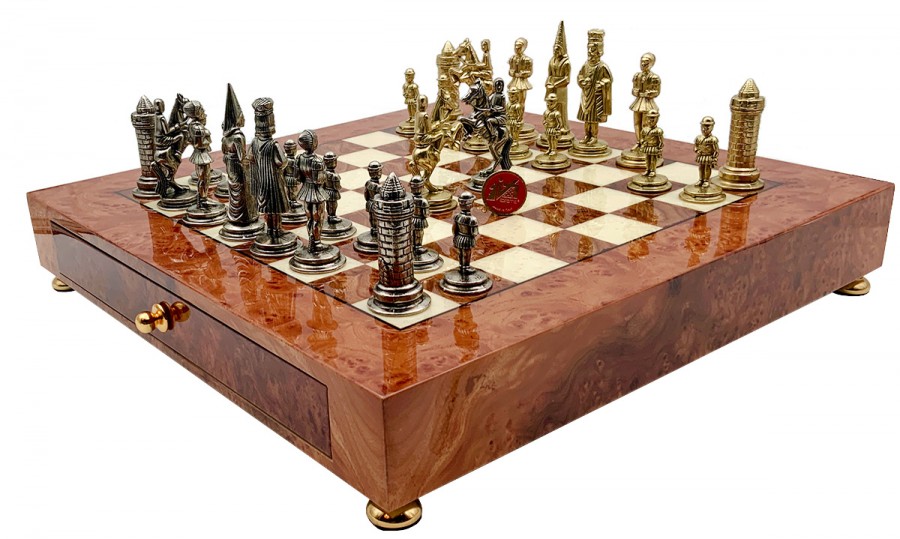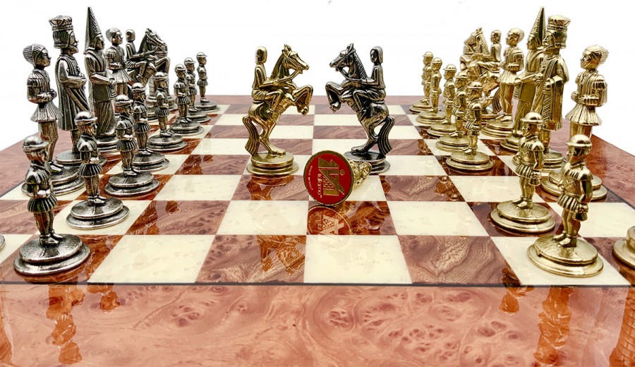 Шахматы всемирно известного итальянского бренда Italfama. Доска изготовлена из дерева. Размеры доски: 42 x 42 cm, размер квадрата: 4 cm. Фигурки коллекции Camelot Medio изготовлены из цинка, латуни, никеля.