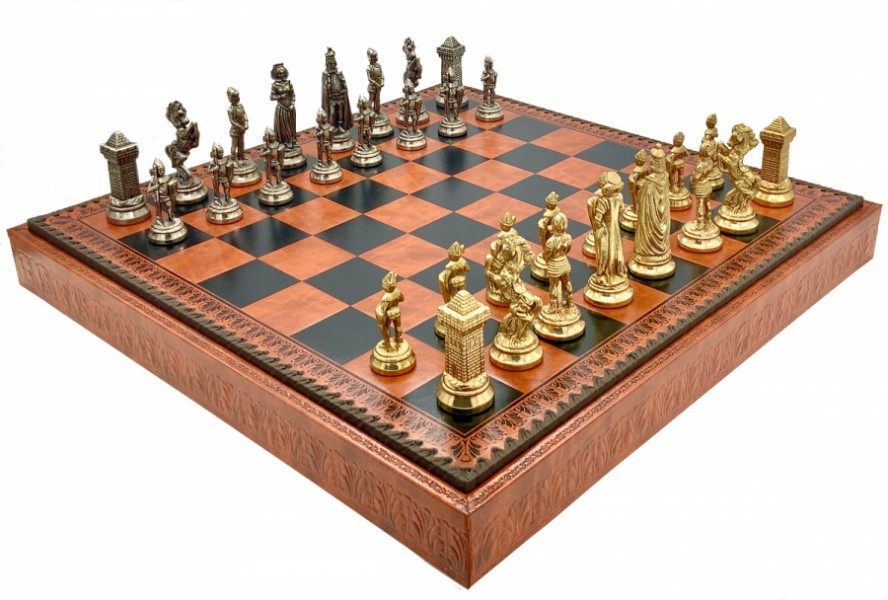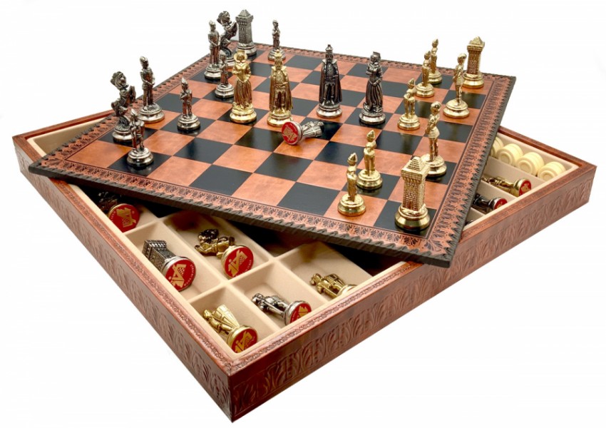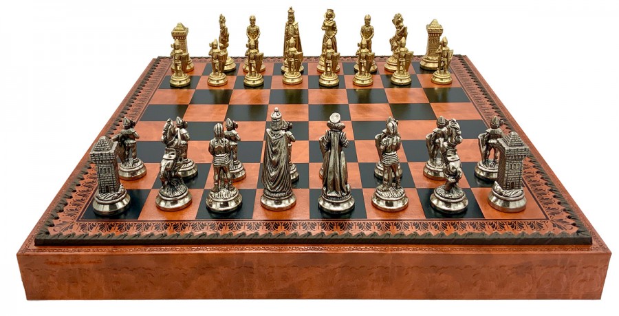 Шахматы всемирно известного итальянского бренда Italfama. Доска изготовлена из экокожи. Размеры доски: 48 x 48 x 5,5 cm, размер квадрата: 5,2 cm. Фигурки коллекции "Maria Stuarda" изготовлены из цинка, латуни, никеля.