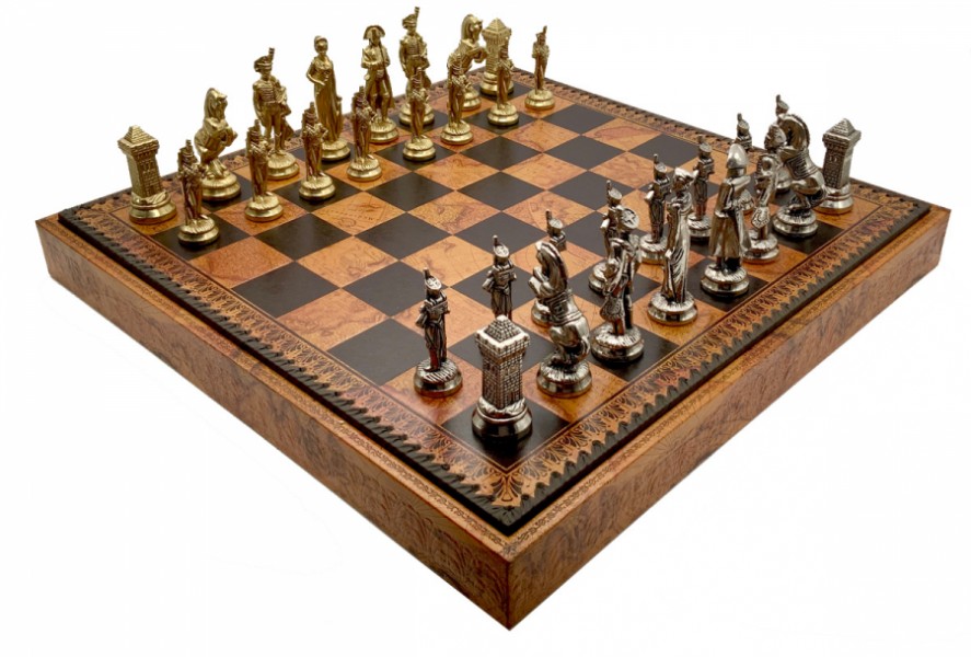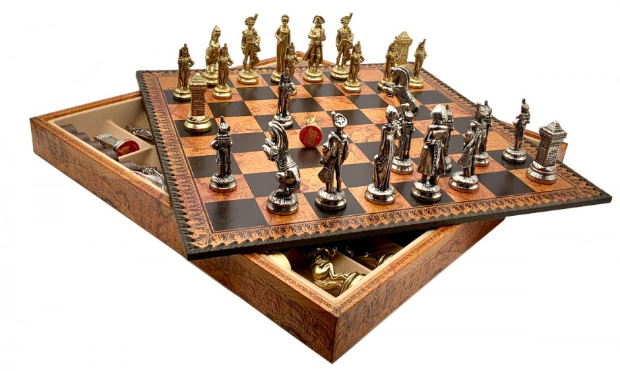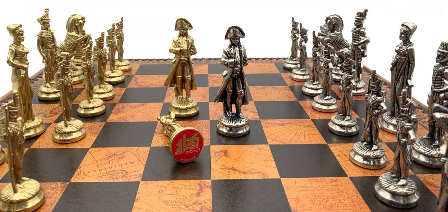 Шахматы всемирно известного итальянского бренда Italfama. Доска изготовлена из экокожи. Размеры доски: 48 x 48 x 5,5 cm, размер квадрата: 5,2 cm. Фигурки коллекции "Napaleone" изготовлены из цинка, латуни, никеля. Размер короля: 10 cm - Ø base 3,2 cm. В комплекте идут шашки, нарды.