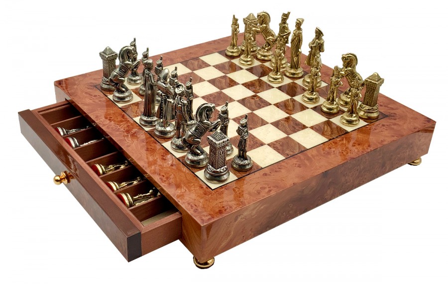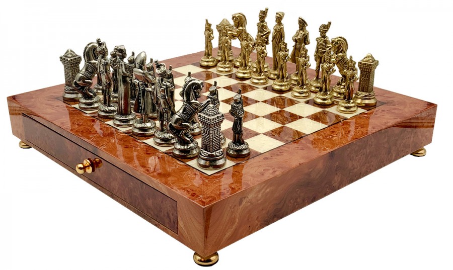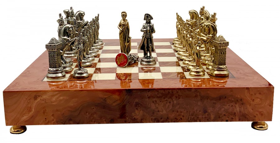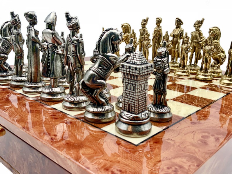 Шахматы всемирно известного итальянского бренда Italfama. Доска изготовлена из дерева. Размеры доски: 42 x 42 cm, размер квадрата: 4,0 cm. Фигурки коллекции "Napaleone" изготовлены из цинка, латуни, никеля.