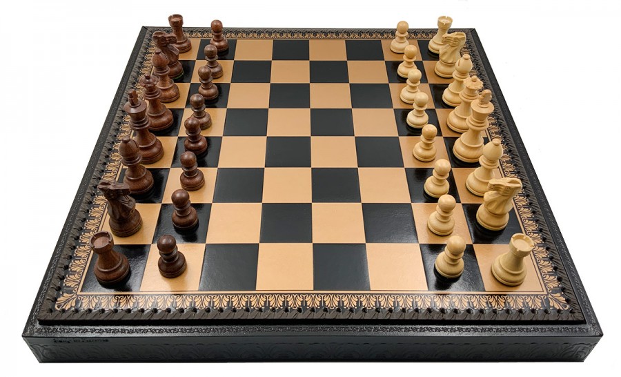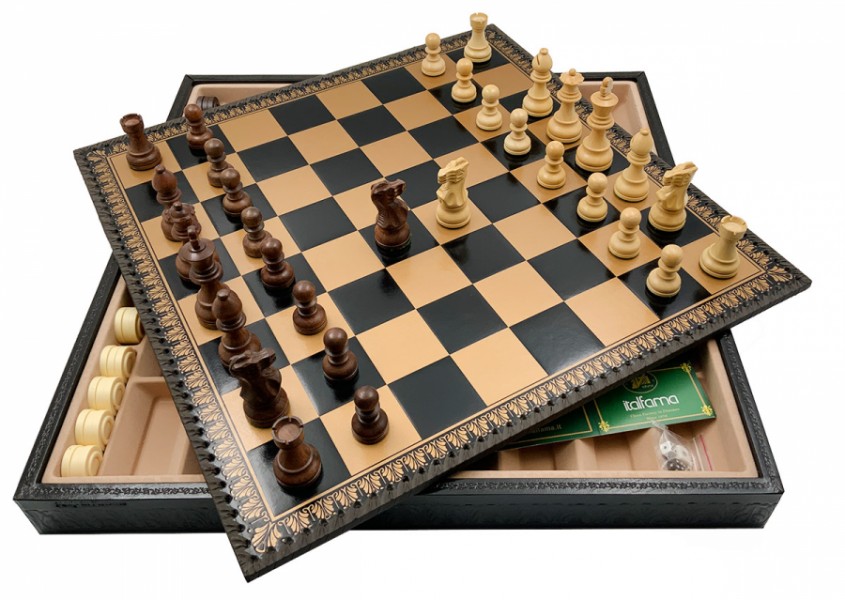 Шахматы всемирно известного итальянского бренда Italfama. Доска изготовлена из экокожи. Размеры доски: 48 x 48 x 5,5 cm, размер квадрата: 5,2 cm. Фигурки коллекции "Palissandro Dorato" изготовлены из дерева, дополнительно утяжеленные. Размер короля: 8,5 cm, диаметр 3,3 см. В комплекте идут шашки, нарды.