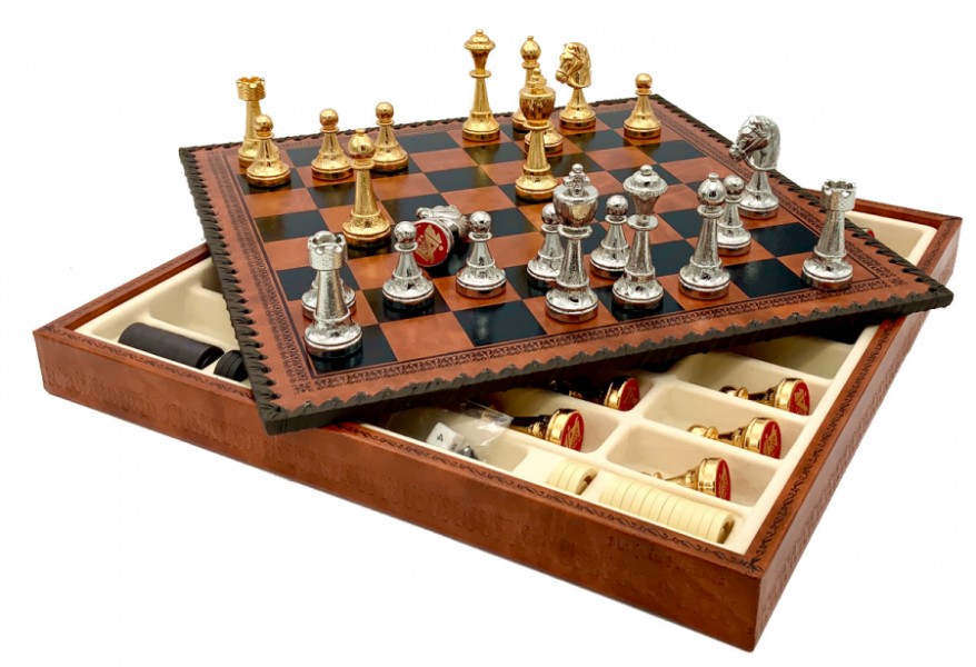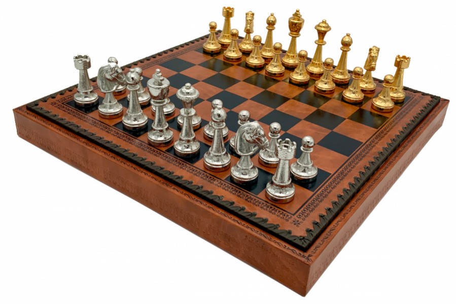 Шахматы всемирно известного итальянского бренда Italfama. Доска изготовлена из экокожи. Размеры доски: 35 x 35 x 3,5 cm, размер квадрата: 2,8 cm. Фигурки коллекции "Staunton" изготовлены из латуни + золото 24К и серебро 925 пробы.