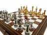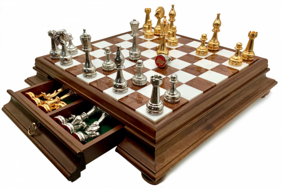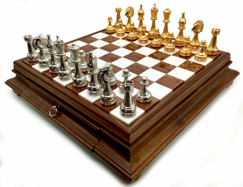 Шахматы всемирно известного итальянского бренда Italfama. Доска изготовлена из дерева и мрамора. Размеры доски: 47 x 47 x 10,5 cm, размер квадрата: 4,5 cm. Фигурки коллекции "Fiorito" изготовлены из латуни + позолота 24К и серебро 925 пробы.