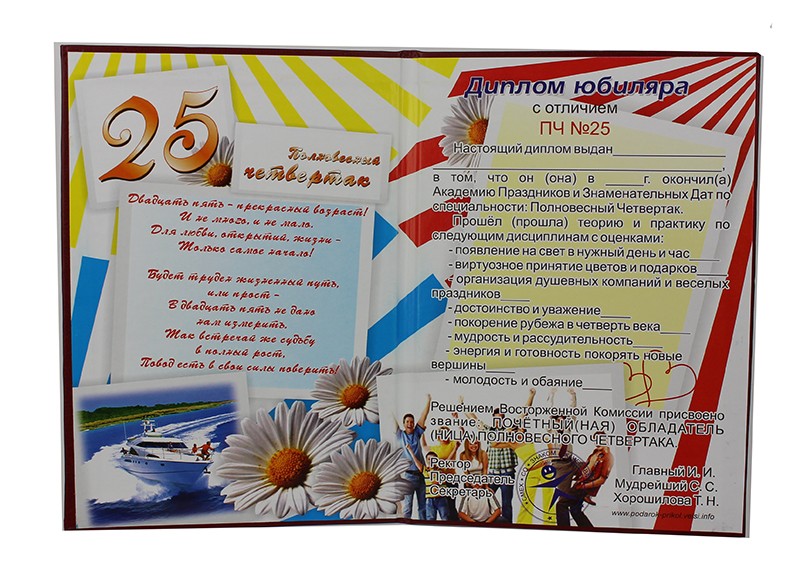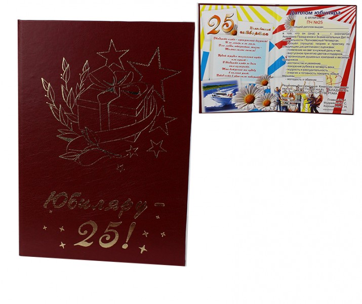 Диплом Юбиляру 25 - отличным дополнением к основному подарку может стать подарочный диплом в честь Юбилея. Данный диплом двусторонний, он в виде книжки. На первой половинки диплома прекрасные стихи про юбилей 25 лет. А вторая половина диплома подтверждает, что юбиляр закончил школу «мудрости и опыта». Так же там перечислены все достоинства юбиляра. Размер 15*21 см