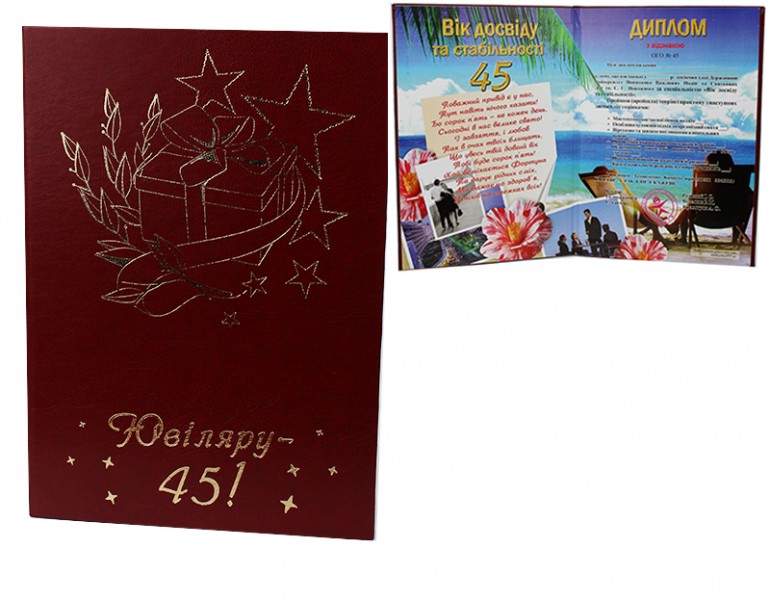 Диплом ювіляру 45 - отличным дополнением к основному подарку может стать подарочный диплом в честь Юбилея. Данный диплом двусторонний, он в виде книжки. На первой половинки диплома прекрасные стихи про юбилей 45 лет. А вторая половина диплома подтверждает, что юбиляр закончил школу «мудрости и опыта». Так же там перечислены все достоинства юбиляра. Размер 15*21 см