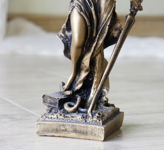Отличный подарок для адвоката или человека, связанного с судом. Классическая статуэтка фемида средняя бронзового цвета (из полистоуна). Изготовлена в размерах: 42*18*18см. Все складки одежды или волос сделаны так будто это настоящий человек. Очень детальная и продуманная фигура. Идёт на маленькой квадратной подставке. Фигура в тунике с разрезами, открывающей ноги. С завязанными глазами, она держит в правой руке меч, а в левые весы. Под ногами у нее книга и тело змеи, которую она прижимает ногой – что весьма символично и образно. Такая фигурка подойдёт для офиса или рабочего кабинета. И как качественный и интересный подарок на день рождения коллеге, другу, начальнику.
