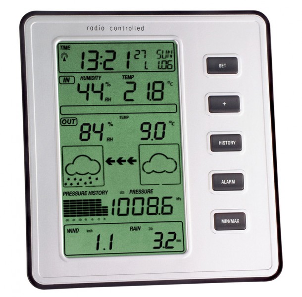 Кроме того, встроенный электронный барометр измеряет давление воздуха и, основываясь на изменениях, символ погоды предоставляет прогноз на предстоящую погоду. Текущее давление воздуха отображается в виде абсолютного и относительного значения, график последних 24 часов можно наблюдать на гистограмме и, таким образом, получить более точное представление о погоде.