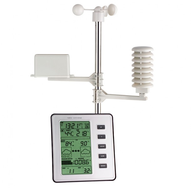Комплектация: Базовая станция, термо-гигро датчик 30.3151, датчик осадков 30.3152, датчик силы ветра 30.3153, батарейки, инструкция по эксплуатации