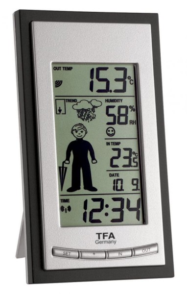 Шляпка, зонтик или плавки? В 15 вариациях синоптик "WEATHER BOY" всегда показывает правильную одежду для текущей температуры наружного воздуха. Необходимое значение для прогноза определяется через собственный беспроводной передатчик в вашей местности. Солнце, облака или капли дождя? Эти погодные символы вместе с «WEATHER BOY» рассчитываются встроенным электронным барометром на основании измеренных изменений атмосферного давления.