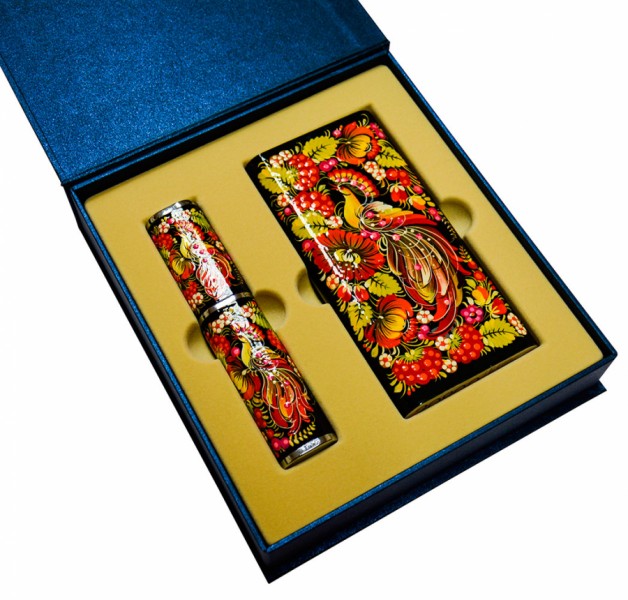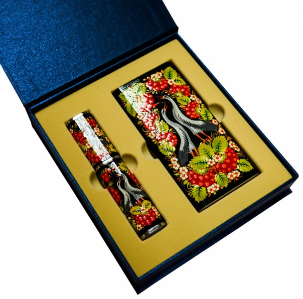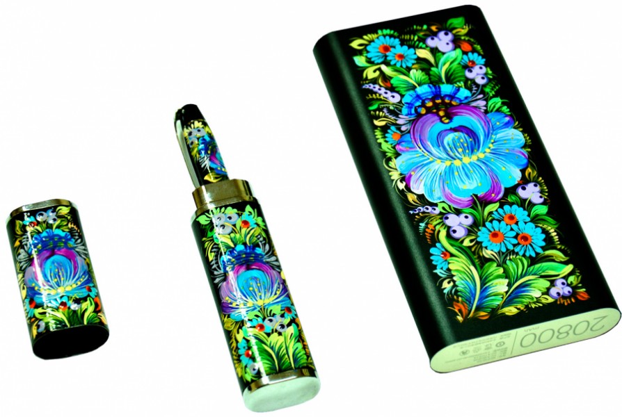 Стильный подарочный набор в коробе с бархатным ложементом внутри включает в себя: металлическую ручку в футляре (производство Германия), Power Bank Xiaomi емкостью 20000mAh. Ручка, футляр и Power Bank расписаны мастерами подлаковой росписи международного класса (ручная работа). Каждый элемент данного сувенира это произведение технического и художественного искусства.