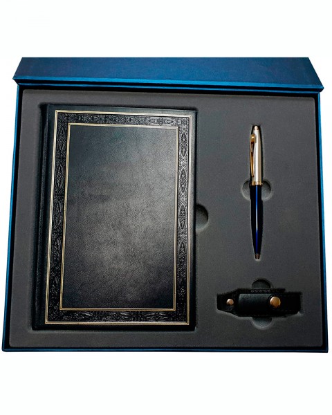 Ежедневник формат А5, размеры: 145х205 мм, натуральная кожа, обрез: золото, серебро, рисованный. USB – флеш – карта Transcend 32,64,128,256,512Gb. Подарочная коробка из переплетного картона декорированная дизайнерским картоном на магнитах и флокированым полимерным ложементом (бархатное покрытие разных цветов) размеры: 305х260х40 мм. Металлическая ручка премиум – класса производство Германия 149x30x21 мм, цвет чернил: синий. По желанию заказчика разрабатываем индивидуальный дизайн данного набора, коробка может быть из натурального дерева, флеш-карта более премиального типа например биометрическая (по отпечатку пальца), ручка по вашему пожеланию, ежедневник по индивидуальному дизайну из любого типа кожи (крокодил, питон и т.д.)