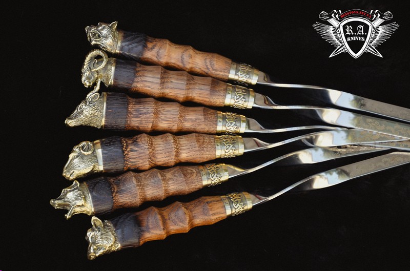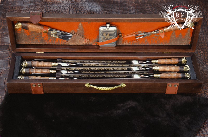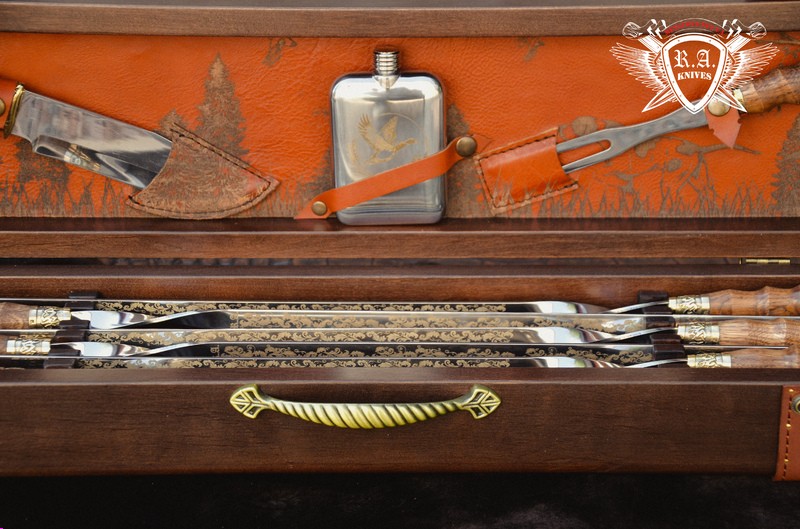 В набор входит все самое необходимое (шампуры 6шт., нож, вилка, фляга):