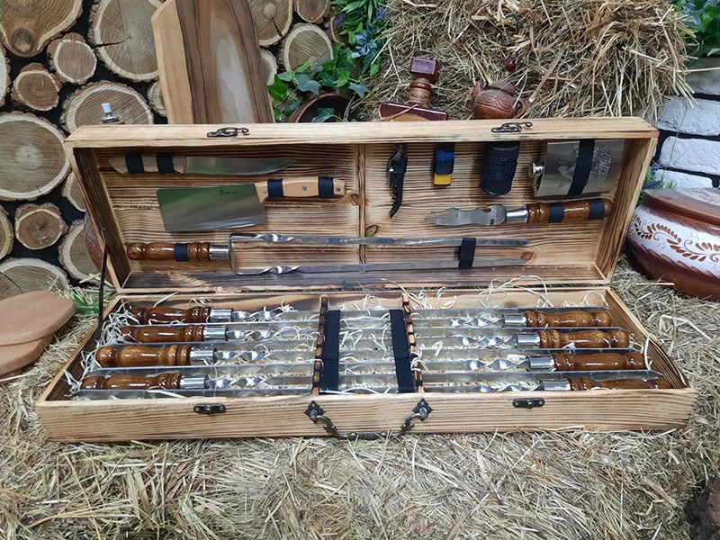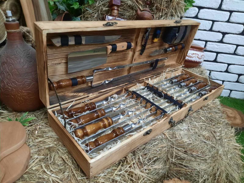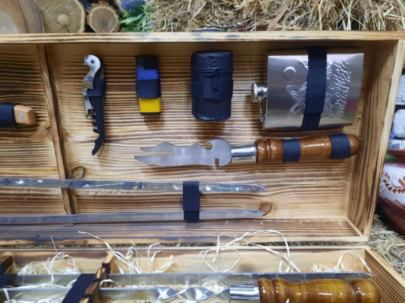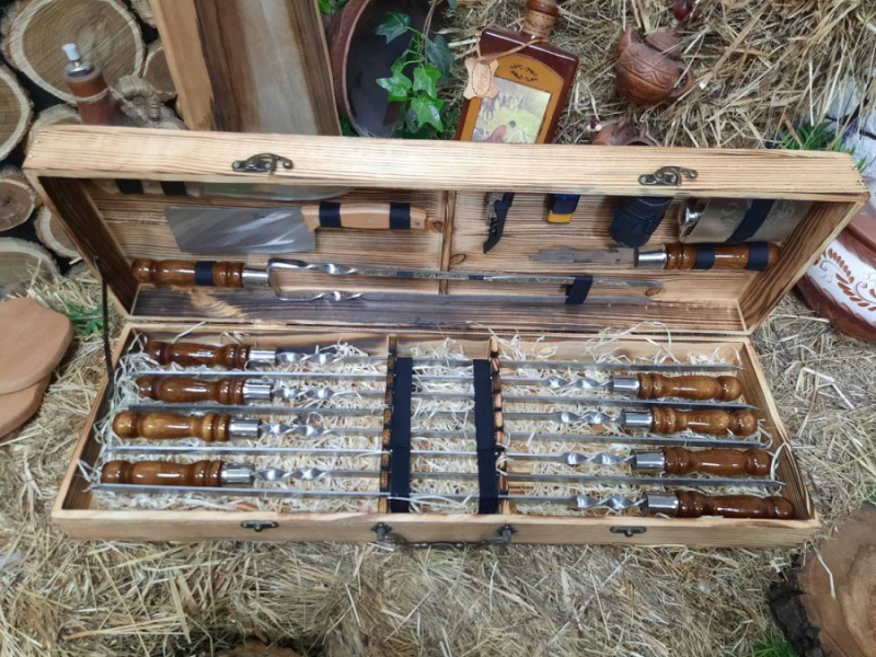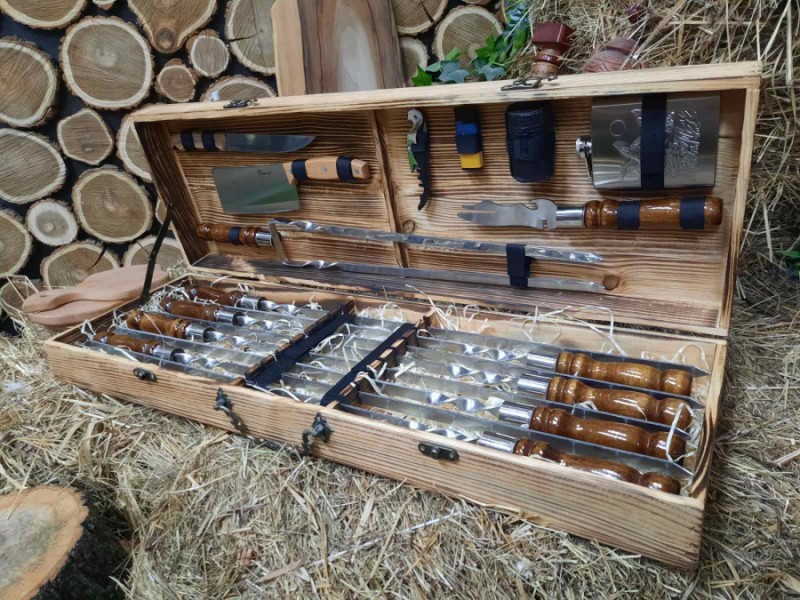 В наборе 8 шампуров, фляга из нержавеющей стали, вилка для снятия мяса, нож охотничий, 4 рюмки, нож для овощей, барный нож, двойной шампур для стейка, ребрышек и курицы, зажигалка газовая.