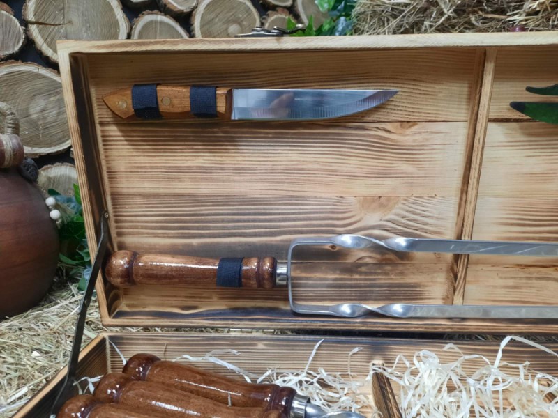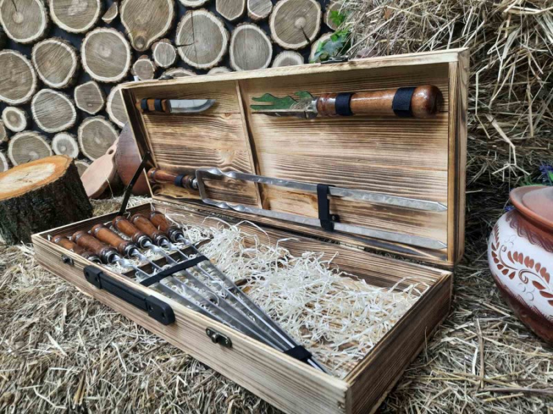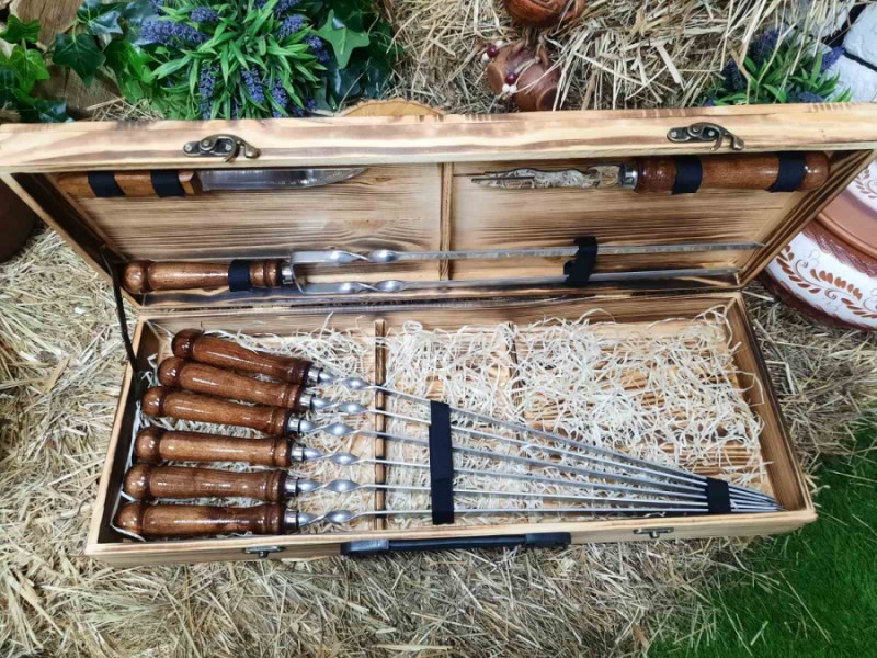 Набор из 6 шампуров для мяса (630х10х3 мм) + комплект аксессуаров в деревянном кейсе