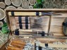 Комплексный набор СОБСТВЕННОГО ПРОИЗВОДСТВА в который входит все для приготовления шашлыка : 6 шампуров, щипцы для гриля, лопатка для гриля, вилка для снятия мяса, 4 тарелки, 4 вилки, 4 ножа для стейка.