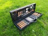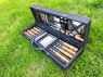Комплексный набор в который входит все для приготовления шашлыка : 8 шампуров, нож туристический, топорик туристический, двойной шампур для курицы, стейка и ребрышек, вилка для снятия мяса, барный нож, набор рюмок, фляга, зажигалка газовая, 4 тарелки, 4 вилки, 4 ножа для стейка, набор для специй.