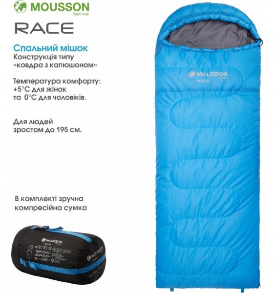 Ми використали два шари наповнювача IsoHole 8S щільністю 100 гр/м² кожен. Один шар наповнювача пришитий до зовнішнього матеріалу, а інший до внутрішнього зі зміщенням швів для максимального утримання тепла. Зовнішні S-подібні та внутрішні горизонтальні шви не співпадають між собою і тому в жодному випадку не утворять так званих «містків холоду». Зовнішній технологічний шар поліестеру 190T з водовідштовхуючим мембранним просоченням не пропустить всередину спальника вологу і при тому залишається «дихаючим» матеріалом. Внутрішній матеріал поліестер понджі 190T м’який і приємний на дотик та володіє низькою гігроскопічністю, що так важливо в сиру погоду. Два спальні мішки можуть об’єднуватись в єдиний простір, де ночуватимуть двоє осіб, що гарантує надійне збереження тепла всередині. Для забезпечення з’єднання вам слід обрати один спальник MOUSSON RACE з правим замком та один – з лівим.