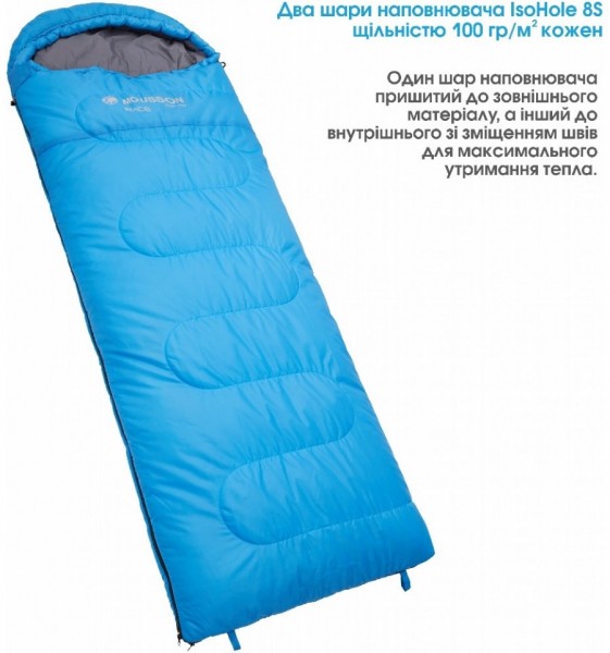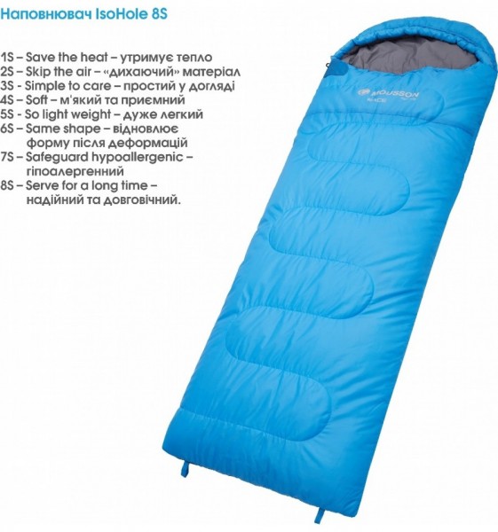 Серія спальних мішків MOUSSON RACE виконана в популярній конструкції «ковдра з капюшоном» та буде найбільш комфортною у використанні за температури +5°С для жінок та 0°С для чоловіків. За потреби спальний мішок повністю розстібається та стає ковдрою. Чудово підійде людям зі зростом до 195 см. Внутрішній наповнювач IsoHole 8S з ідеально підібраною кількістю шарів та щільністю надійно утримує тепло і при цьому пропускає повітря, легко відновлює форму після стискання. Наповнювач IsoHole 8S завдяки своїм особливостям: