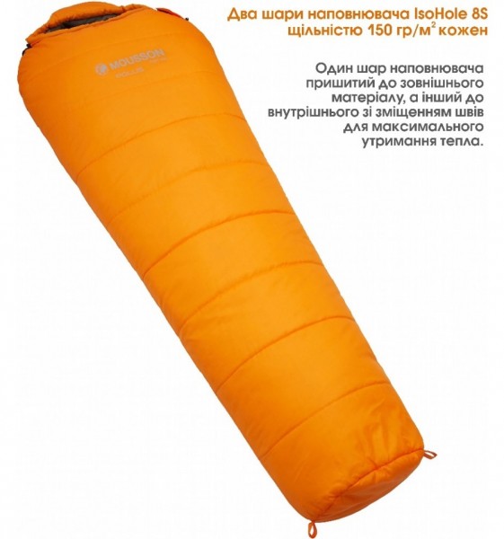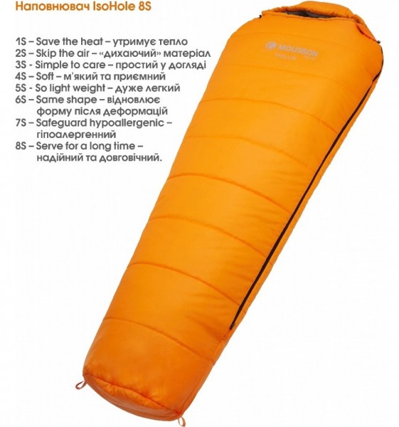 Високотехнологічна серія спальних мішків MOUSSON POLUS має зручну анатомічну форму «кокон», що повторює контури тіла людини та сприяє максимальному збереженню тепла всередині. Спальні мішки MOUSSON POLUS будуть найбільш комфортними у використанні за температури -2°С для жінок та -7°С для чоловіків. Чудово підійдуть людям зі зростом до 195 см. Внутрішній наповнювач IsoHole 8S з ідеально підібраною кількістю шарів та щільністю надійно утримує тепло і при цьому пропускає повітря, легко відновлює форму після стискання. Наповнювач IsoHole 8S завдяки своїм особливостям: