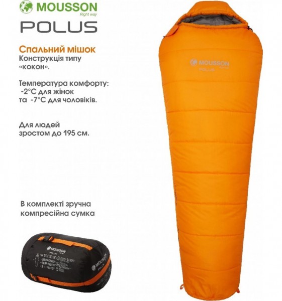 Ми використали два шари наповнювача IsoHole 8S щільністю 150 гр/м² кожен. Один шар наповнювача пришитий до зовнішнього матеріалу, а інший до внутрішнього зі зміщенням швів для максимального утримання тепла. Зовнішній технологічний шар поліестеру 210Т з водовідштовхуючим мембранним просоченням не пропустить всередину спальника вологу і при тому залишається «дихаючим» матеріалом. Зовнішній матеріал також має додаткове армування Ripstop, котре запобігає розриванню тканини. Внутрішній матеріал поліестер понджі 210Т м’який і приємний на дотик та володіє низькою гігроскопічністю, що так важливо в сиру погоду. Два спальні мішки можуть об’єднуватись в єдиний простір, де ночуватимуть двоє осіб, що гарантує надійне збереження тепла всередині. Для забезпечення з’єднання вам слід обрати один спальник MOUSSON POLUS з правим замком та один – з лівим.