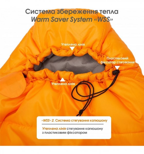 Система стягування, що максимально зберігає тепло (утеплений комір зі стяжкою та застібкою велкро для максимального утеплення; утеплена лінія стягування капюшону; пластиковий фіксатор закріплений в найбільш зручному місці стягування)