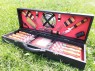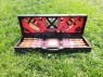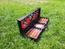 Комплексный набор в который входит все для приготовления шашлыка : 8 шампуров, нож мясника Tramontina, нож-тесак для нарезания овощей, вилка для снятия мяса, барный нож, набор рюмок, 4 тарелки, 4 вилки, 4 ножа для стейка, набор для специй.