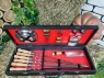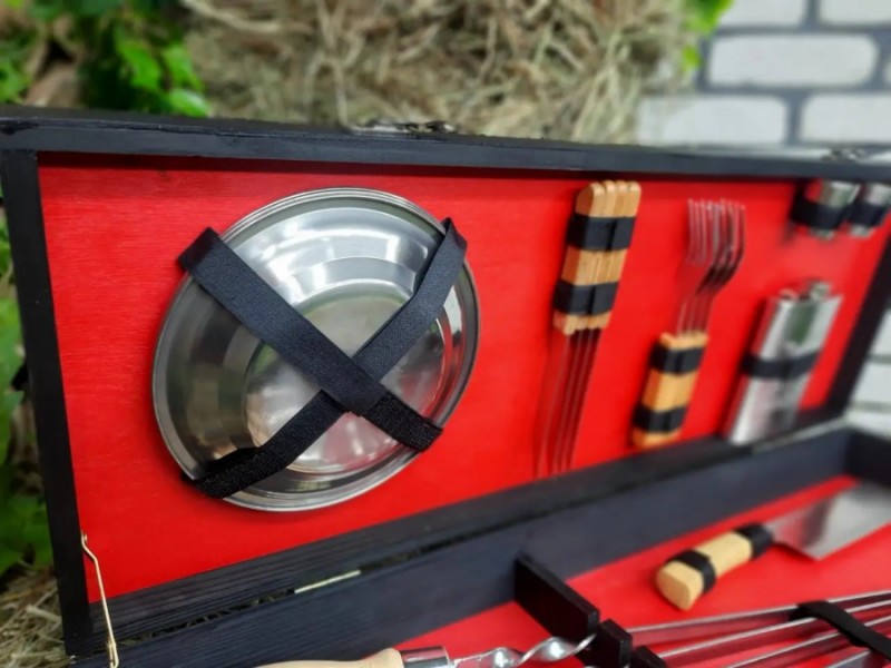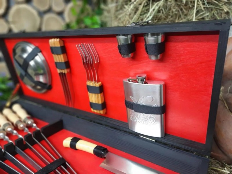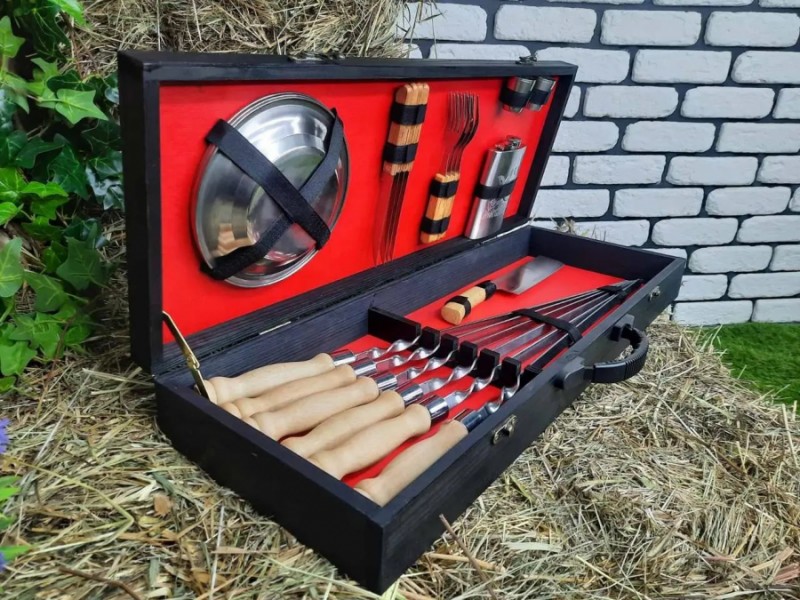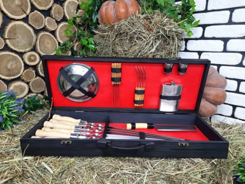Комплексный набор , в который входит все для приготовления шашлыка : 6 шампуров, набор из 4 рюмок, фляга, 4 тарелки, 4 вилки, 4 ножа для стейка, топорик-секач для мяса.