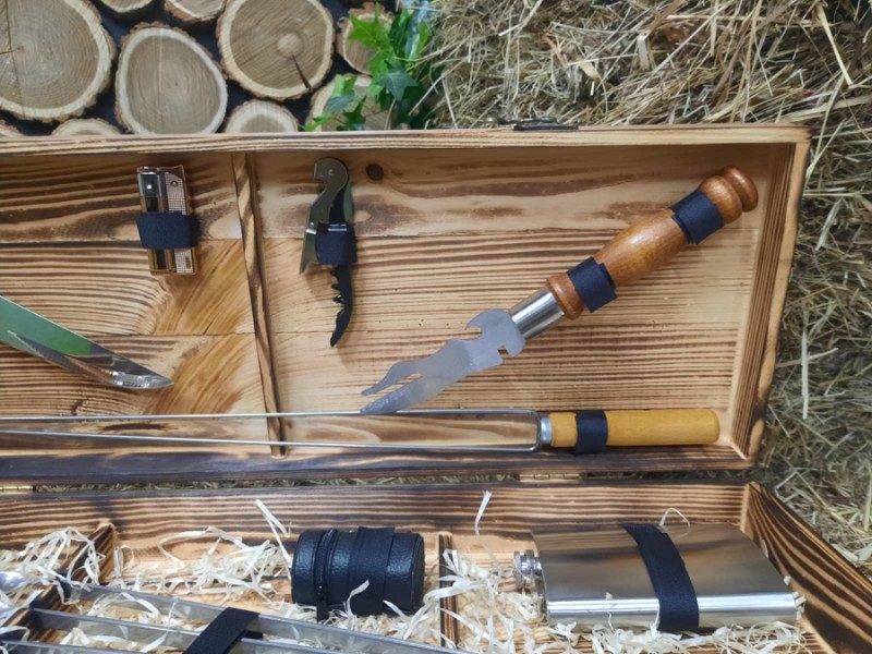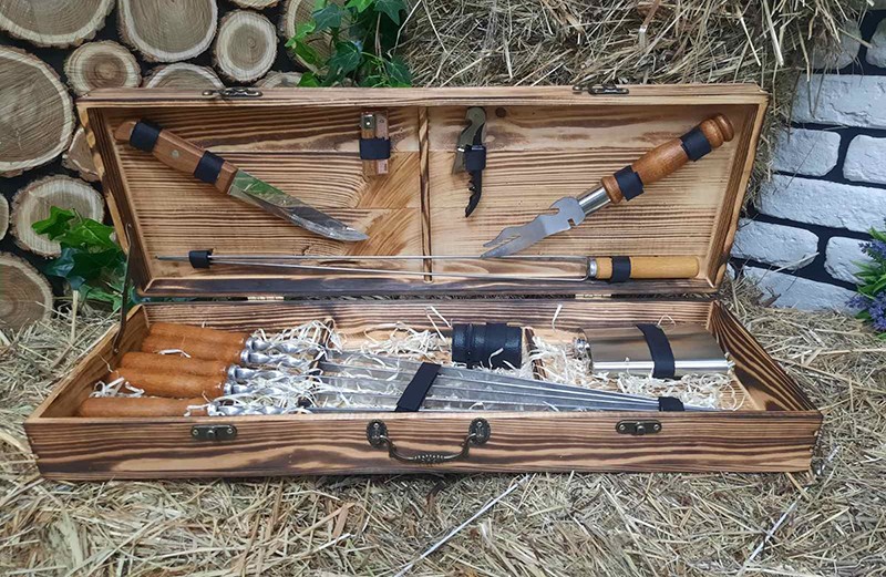 Комплексный набор в который входит все для приготовления шашлыка: 6 шампуров, нож, вилка для снятия мяса, набор рюмок, фляга, барный нож, сжигатель, шампур для овощей.