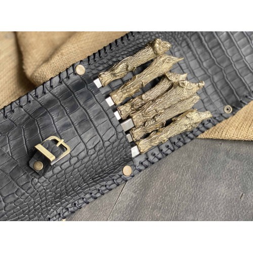 Набор шампуров с бронзовыми литыми ручками. Поставляется в закрытом колчане из натуральной кожи с теснением.