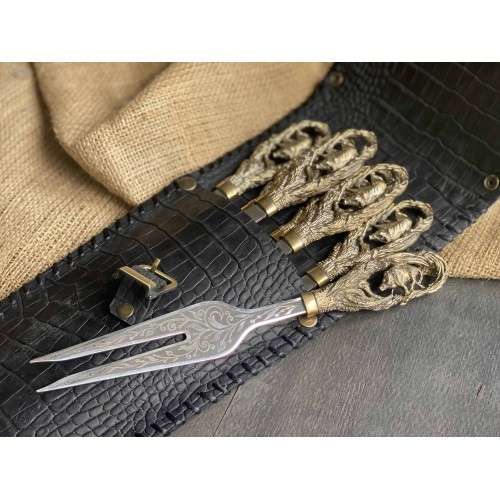 Набор шампуров с бронзовыми литыми ручками. Поставляется в закрытом колчане из натуральной кожи с теснением.