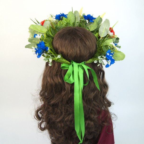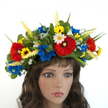 Украинский венок выполнен из искусственных цветов маков, подсолнухов, васильков и др.декоративных элементов. Пышный этнический венок прекрасно подойдет для фотосессии, дефиле, любого выступления на сцене, этно фестиваля, съемок фильма или клипа.