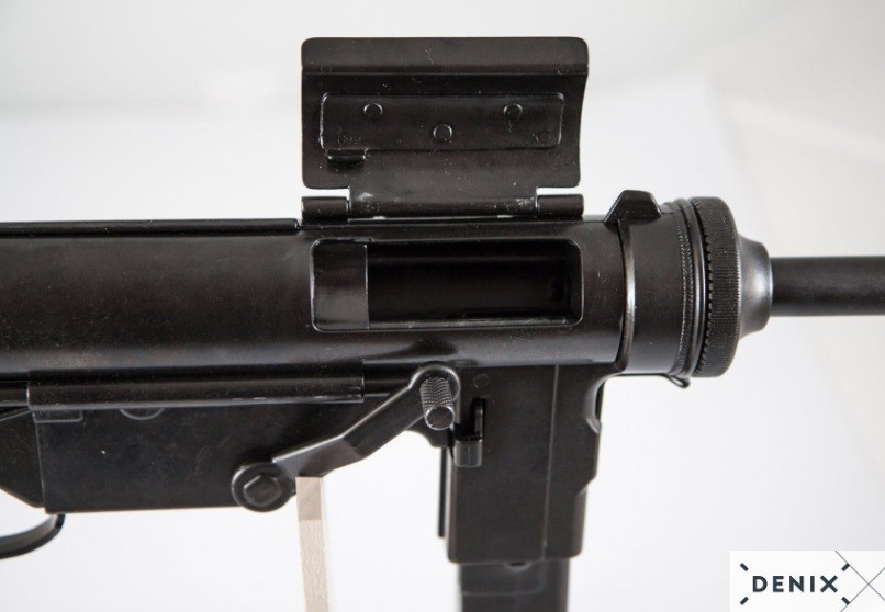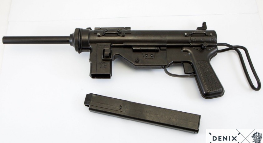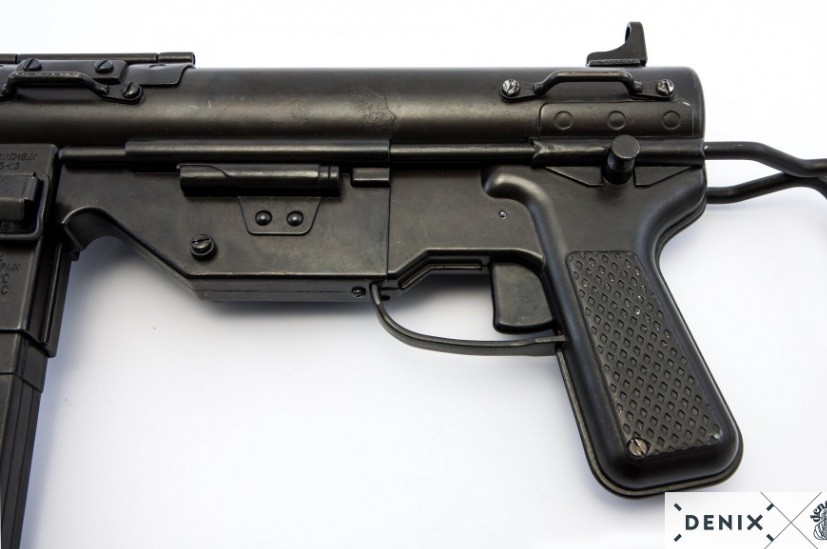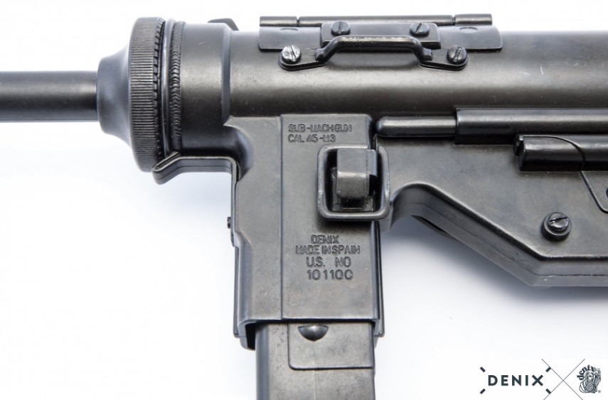 Макет пистолет-пулемет M3 «Grease gun», .45 калибра (США, 1942 г, 2-я Мировая война) DENIX – это полноценная по размеру копия распространенного пистолета-пулемета времен 2-ой Мировой, разработка испанской компании Деникс. Изделие – полная копия боевого оружия под патроны 45 калибра. Макет имеет следующие подвижные элементы: выдвижной приклад, крышка экстрактора, предохранитель, а также магазин съемного типа. Модель имитирует механизм заряжания и стрельбы. У приклада есть два положения. Свое название автомат получил из-за своего внешнего сходства с масленкой.Автомат Гриз ган от Деникс изготовлен полностью из металлического сплава, отличается хорошей сбалансированностью и достойным качеством изготовления и сборки.