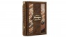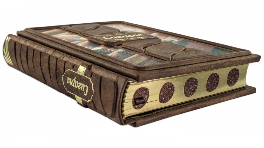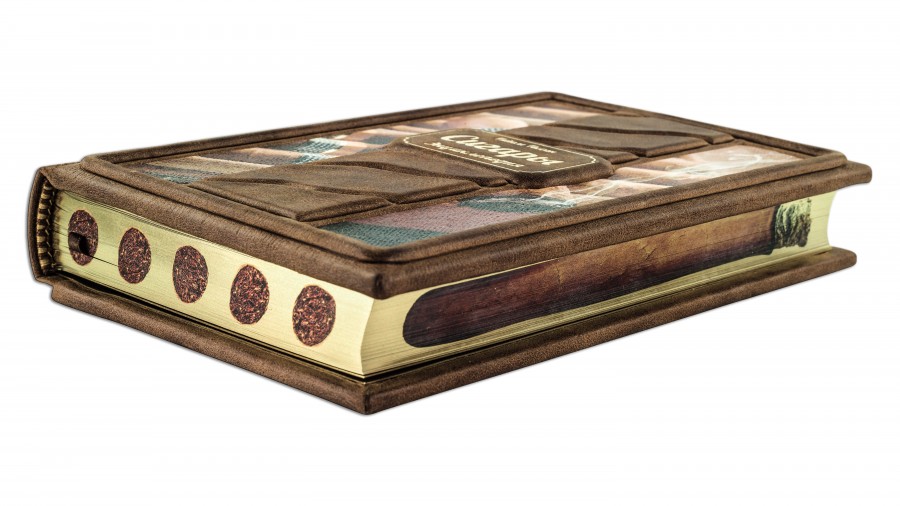 Составной переплет «Брадель», ручной работы, выполнен из натуральной кожи (кожа «Botero» производства итальянской кожевенной фабрики «Claudio»). Обложка книги одноуровневая, оформлена рельефным золотым тиснением, с использованием фольги «Luxor 240», а также декорирована вставками из холста. Обрез блока выполнен в уникальной технологии художественной запечатки золотой основы.