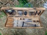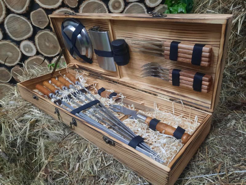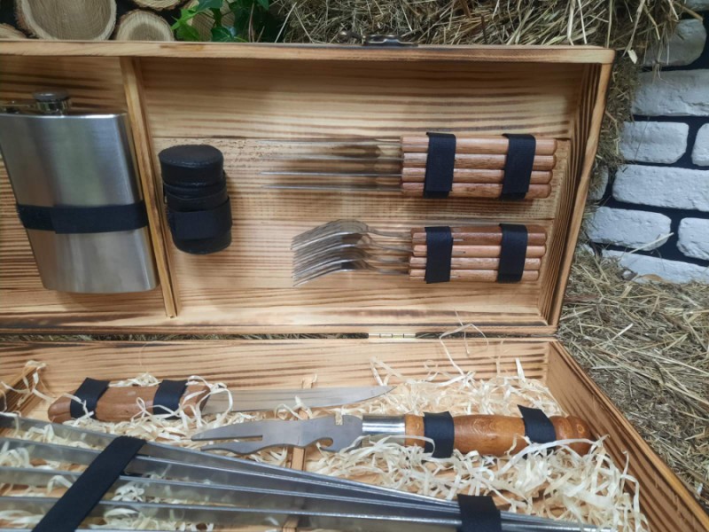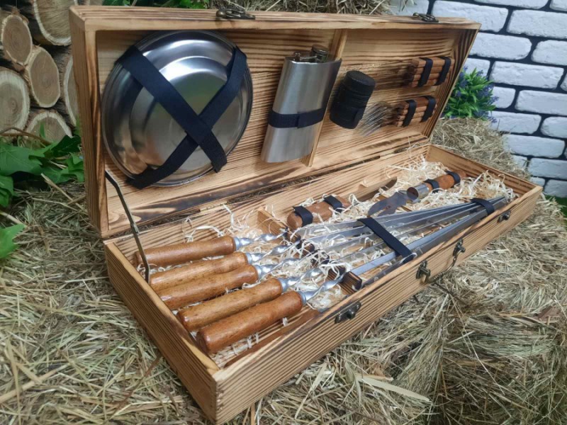 Комплексный набор в который входит все для приготовления шашлыка : 6 шампуров, нож мясника, вилка для снятия мяса, набор рюмок, фляга, 4 тарелки, 4 вилки, 4 ножа для стейка.