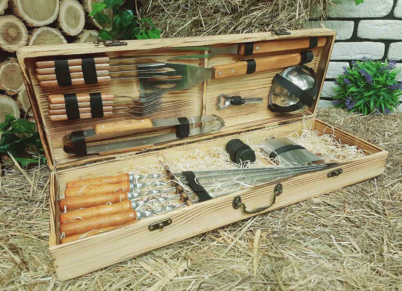 Набор из 6 шампуров для мяса (630х10х3 мм) + комплект аксессуаров в деревянном кейсе