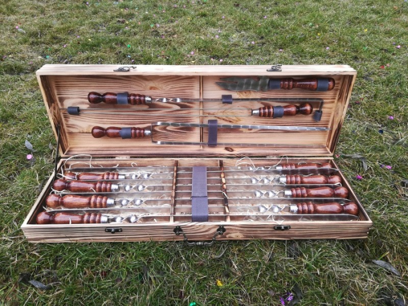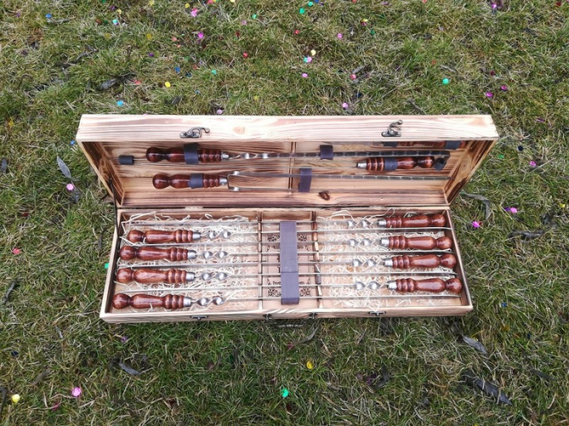 В наборе 8 шампуров + двойной шампур для курицы, стейка и ребер + двойной шампур для грибов и овощей + кочерга + нож-вилка для снятия мяса