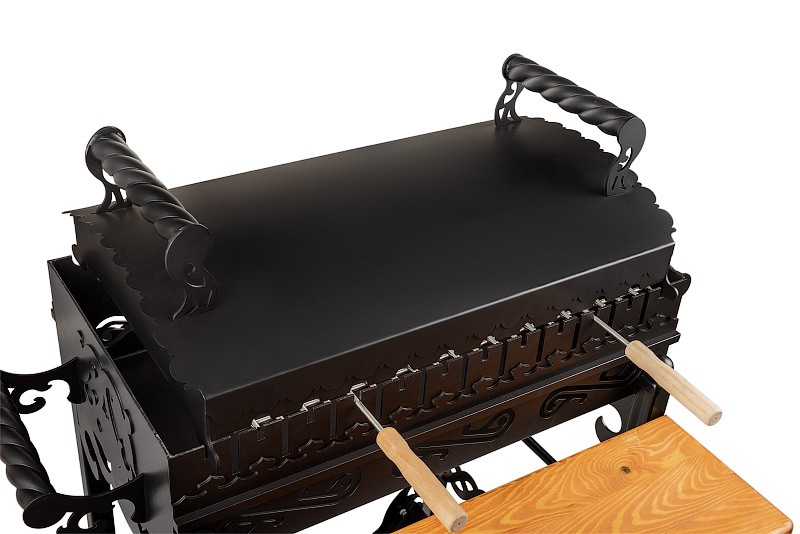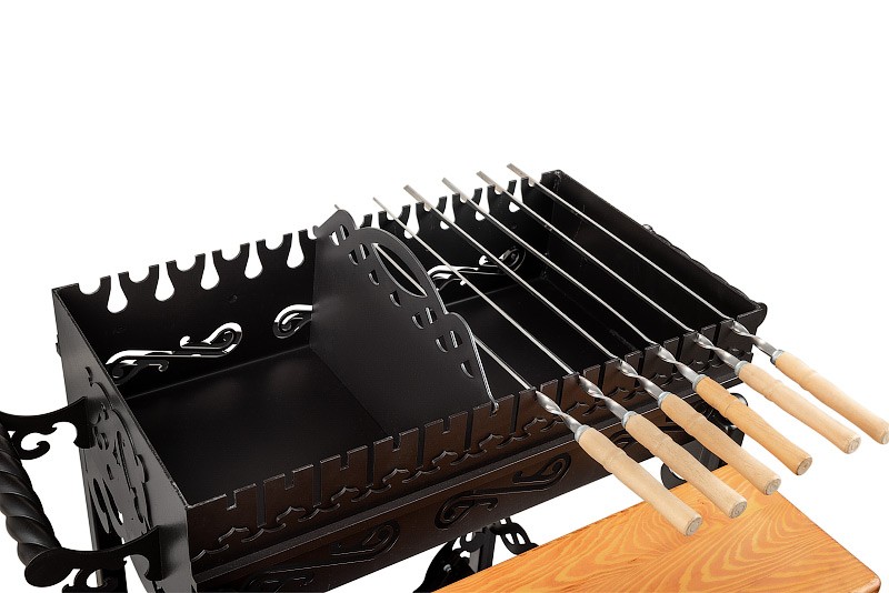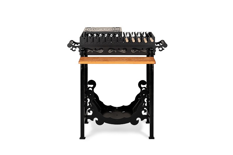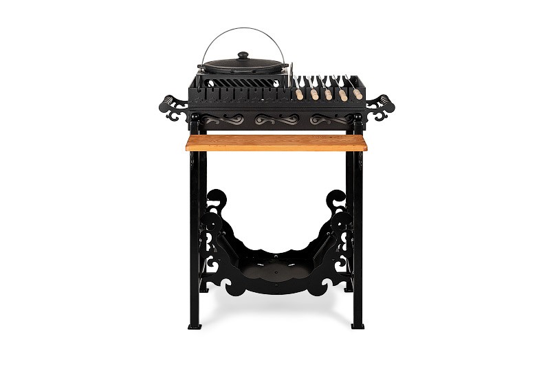 Стационарный мангал от компании Smoke House – это стильная конструкция высокого качества для комфортного приготовления вкуснейших домашних шашлыков, мяса и овощей на гриле, плова, каши, ухи.Мангал изготовлен из высококачественной углеродистой стали. Легко выдерживает перепады температуры, не выделяет токсичных веществ, вредных для здоровья человека.Стенки мангала, толщиной 3 мм не подвержены деформации, покрыты термостойкой эмалью, которая не трескается и не обгорает. Для дополнительной прочности, стенки мангала усилены квадратом с сечением 12 мм. Специальные накладки толщиною 3 мм добавляют жесткости.Благодаря аккуратно зачищенным швам и не острым кромкам, конструкция мангала полностью безопасна, не травмирует кожу в случае неосторожного обращения.Ручки по бокам мангала выполнены из стали и дополняют оригинальный дизайн устройства.Шампура располагаются на двух уровнях в специальных прорезях в стенках мангала. Всего на мангале можно разместить 12 шампуров.К мангалу крепиться небольшая деревянная столешница для вашего удобства. Топливные материалы можно хранить в специальной дровнице, под мангалом.На мангал можно установить решетку-гриль, подставку под казан, которые вы найдёте в каталоге нашего интернет-магазина.Компания Smoke House, как производитель, даёт гарантию 1 год на свою продукцию.Красивая и элегантная конструкция мангала в античном стиле не только украсит дачный участок или двор, но и надолго станет верным помощником в приготовлении различных мясных деликатесов для вас и ваших гостей.