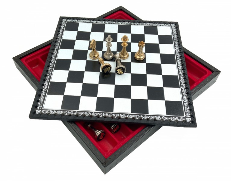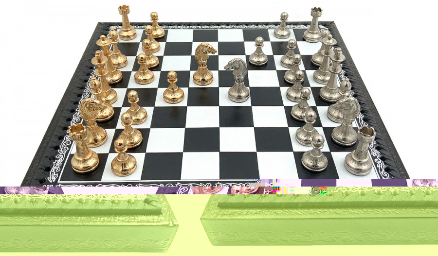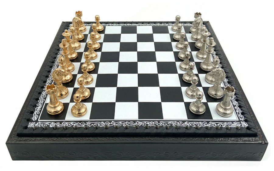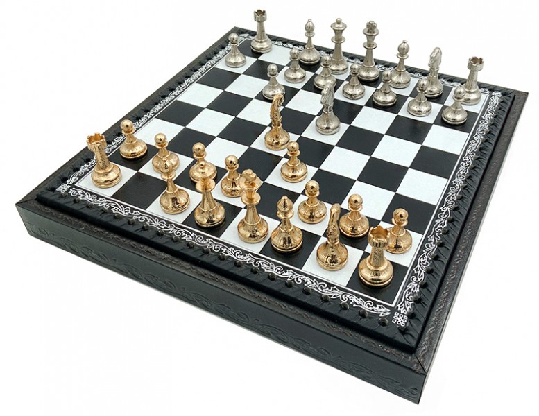 Шахматы всемирно известного итальянского бренда Italfama. Доска изготовлена из экокожи. Размеры доски: 48 x 48 x 5,5 cm, размер квадрата: 5,2 cm.Фигурки коллекции Mignon Fiorito изготовлены из цинка + позолота 24К и серебро 925 пробы. Размер короля: 4,8 cm - Ø base 1,9 cm. Комлект 2 в 1: шахматы + шашки.