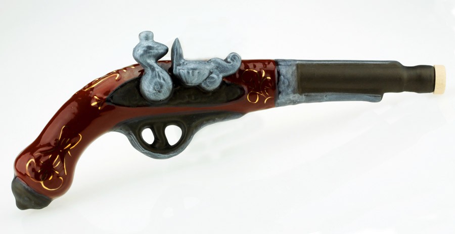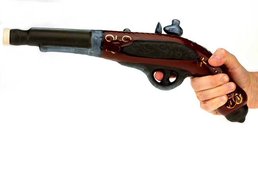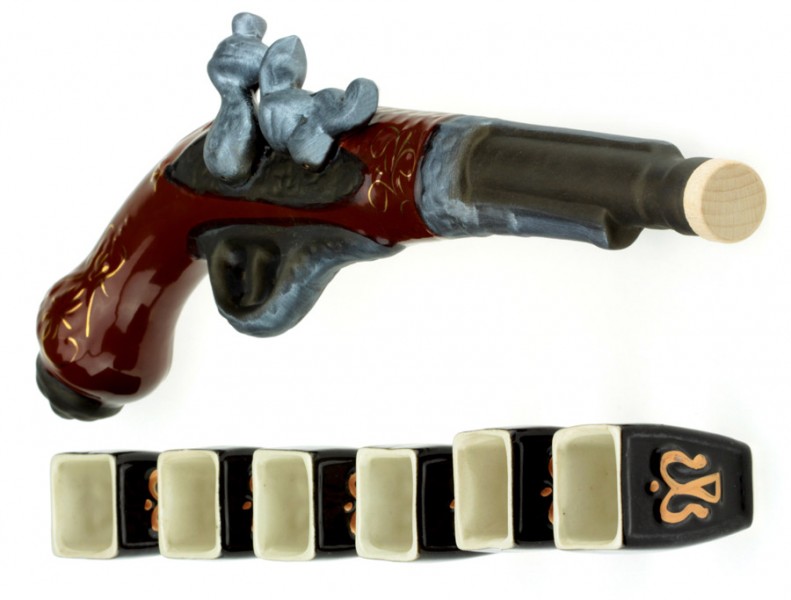 Довольно изящный старинный пистоль на самом деле является необычным графином ! В подарочном наборе есть 6 стилизованных керамических рюмочек.