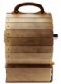 Дизайн бара выполнен в виде бочки - подставки для четырех бутылок. Ячейки для бутылок имеют размер 24*9*8 см, что позволяет хранить самые популярные размеры как винных бутылок, так и крепкого алкоголя. Сверху бара расположена удобная ручка для переноски. В нижнем резном ящике имеются 6 ячеек для рюмок (рюмки не в комплекте). Туда также можно положить различные аксессуары и штопор.